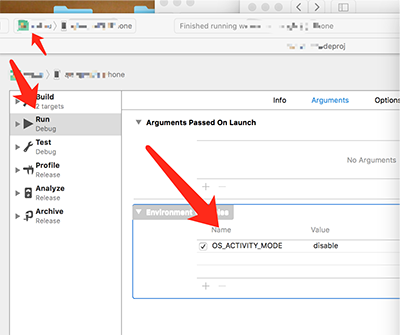 3 xcode 8運(yùn)行打印一堆沒用的東西Xcode 8的問題,解決辦法是設(shè)置OS_ACTIVITY_MODE : disable如下圖: