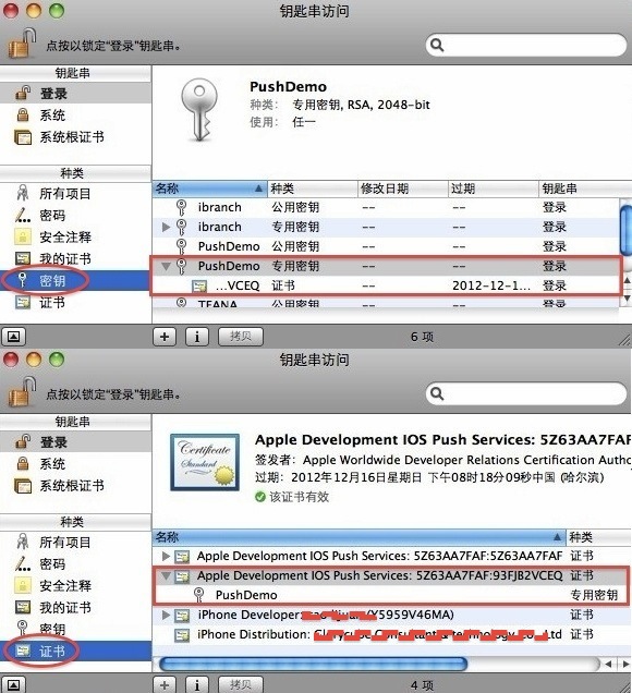 如果生成成功,則會在[鑰匙串訪問|登錄|密鑰]欄目中列出與*.certSigningRequest關(guān)聯(lián)的密鑰,這里是PushDemo,如圖所示: