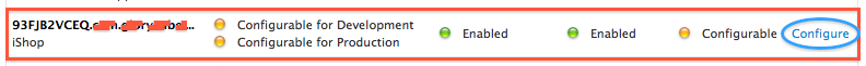(3)配置上一步中生成的App ID,讓其支持消息推送[點擊2-6中的Configureà選中Enable for Apple Push Notification serviceà點擊Configure],如圖所示: