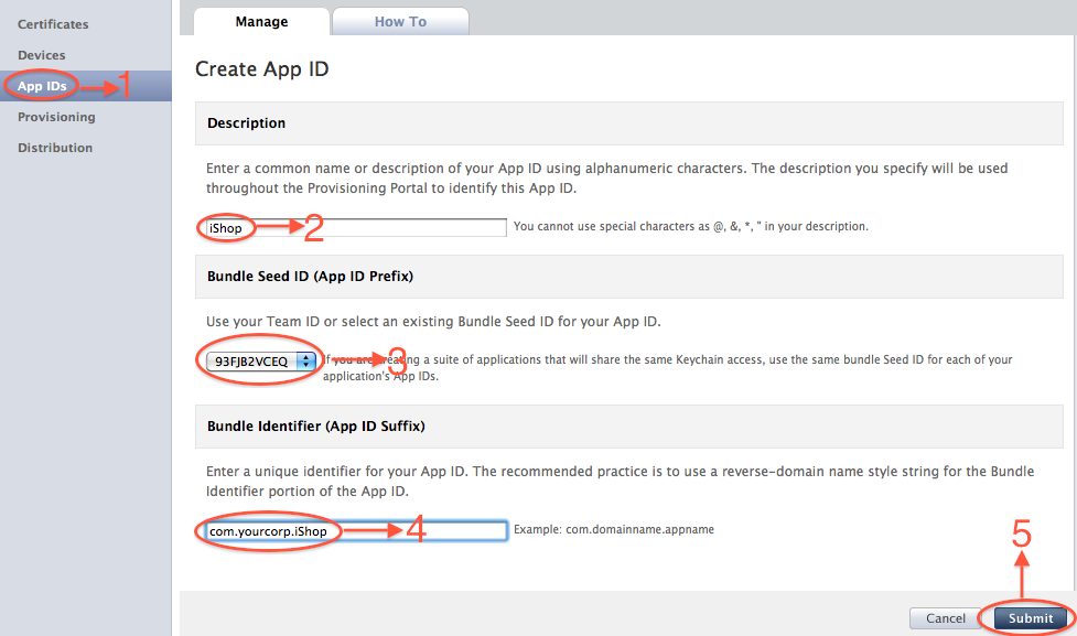 (2)創(chuàng)建New App ID[App IDsàManageàNew App ID]( Description{填寫您對此App ID的描述,如:iShop},Bundle Seed ID(App ID Prefix){選擇綁定App ID前綴,如:默認選擇Generate New},Bundle Identifier(App ID Suffix){填寫綁定App ID后綴,如:com.yourcorp.iShop}),如下圖所示: