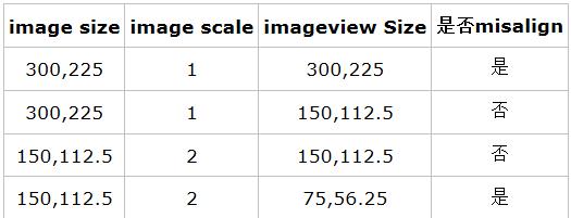 使用300*225像素的png圖片。分別使用不同的方法load到內存中,得到不同的size和scale,然后放在不同size的imageview里。使用color misaligned images來判定是否像素對齊。