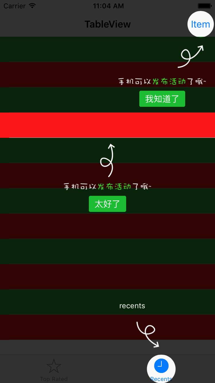 EAFeatureItem *item = [[EAFeatureItem alloc] initWithFocusView:self.exampleCell focusCornerRadius:0 focusInsets:UIEdgeInsetsZero];item.introduce = @"txt_feature_post_activity_4.1.png";item.actionTitle = @"太好了";item.action = ^(id sender){ NSLog(@"touched .."); };EAFeatureItem *recents = [[EAFeatureItem alloc] initWithFocusRect:CGRectMake(centerX - 25, centerY - 25, 50, 50) focusCornerRadius:25 focusInsets:UIEdgeInsetsZero]; recents.introduce = @"recents";[self.navigationController.view showWithFeatureItems:@[item, recents] saveKeyName:@"keyName" inVersion:nil];可以優化的地方