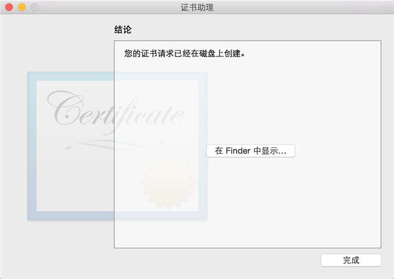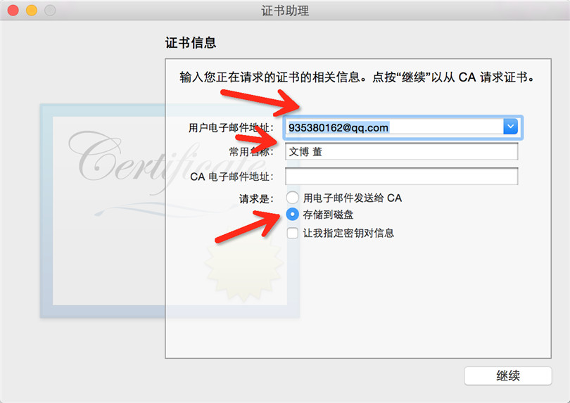 我們需要一個CSR文件,CSR是一個簽名請求文件,意思就是讓我們的MAC具有調(diào)試推送的權(quán)限,點擊繼續(xù)