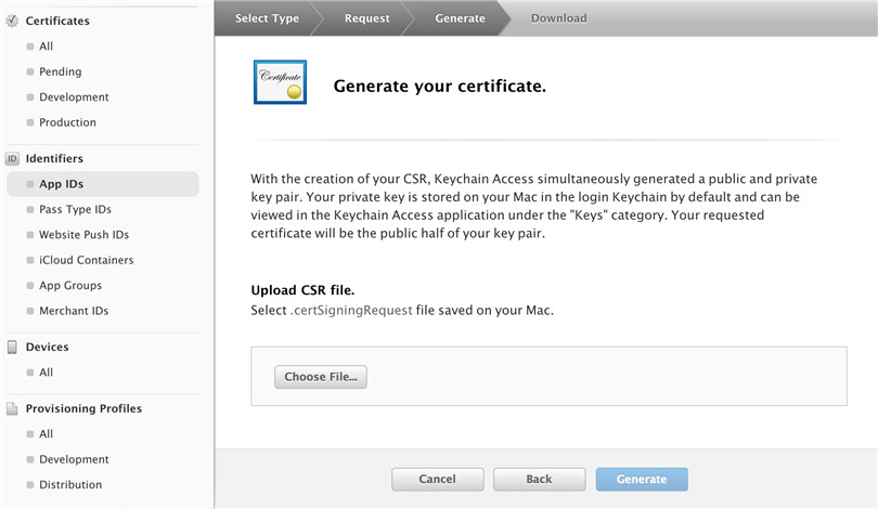 Provider就是我們公司的服務(wù)器,經(jīng)過蘋果的APNs服務(wù)器找到我們的設(shè)備,給我們設(shè)備上的客戶端應(yīng)用推送消息。那APNs服務(wù)器是如何找到我們的設(shè)備和設(shè)備上的應(yīng)用呢,答案就是DeviceToken,DeviceToken需要配置推送證書才可以獲得,推送證書需要知道我們的APP ID(應(yīng)用的BundleID,應(yīng)用唯一標識)和UDID(設(shè)備唯一標識),還有自己服務(wù)器的UDID,我們先來打一個推送證書,登錄開發(fā)者中心,點擊證書模塊
