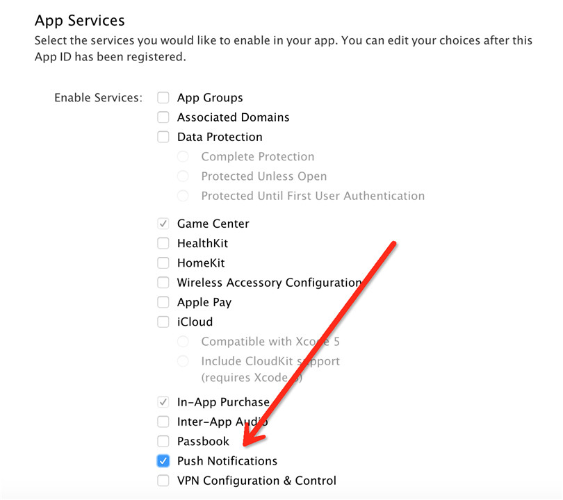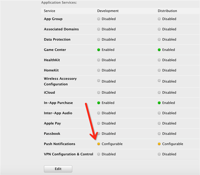 發(fā)現(xiàn)Push服務(wù)是黃色警告,這時點擊Edit,找到推送模塊,我們需要配置推送證書了,點擊紅色箭頭所指的位置