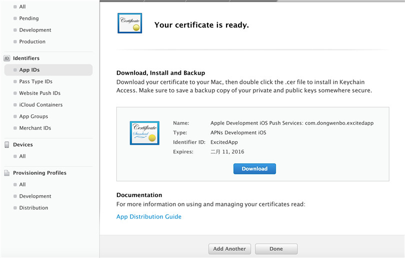 一直點擊下一步,完成,在App IDs 列表里面找到我們的ExcitedApp,我們看到