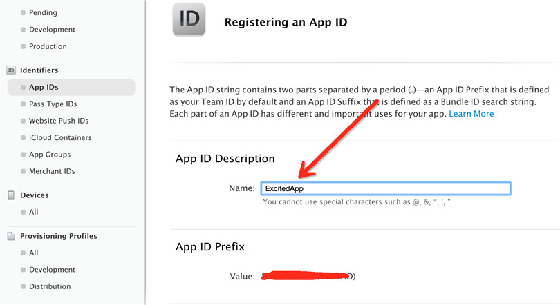 箭頭所指為應(yīng)用ID描述,我們假設(shè)寫了一個很牛逼的應(yīng)用,ExcitedApp,接下來我們填入App ID,注意這里的App ID是固定的,不能有星號