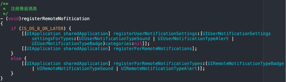 首先是在注冊(cè)遠(yuǎn)程消息推送,需要注意的是iOS8及以后的系統(tǒng)中注冊(cè)方法有所改變(同時(shí)證書設(shè)置以及push權(quán)限也需要開啟)。這一步的目的是,允許app接收遠(yuǎn)程消息推送。