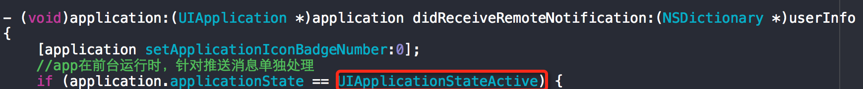 屏幕上會(huì)出現(xiàn)通知提醒,如果點(diǎn)開消息進(jìn)入app,app運(yùn)行到前臺(tái)時(shí)會(huì)調(diào)用“didReceiveRemoteNotification”方法,這也就是之前為什么要區(qū)分一下applicationState的原因,因?yàn)槎叨际峭ㄟ^這一步來處理。