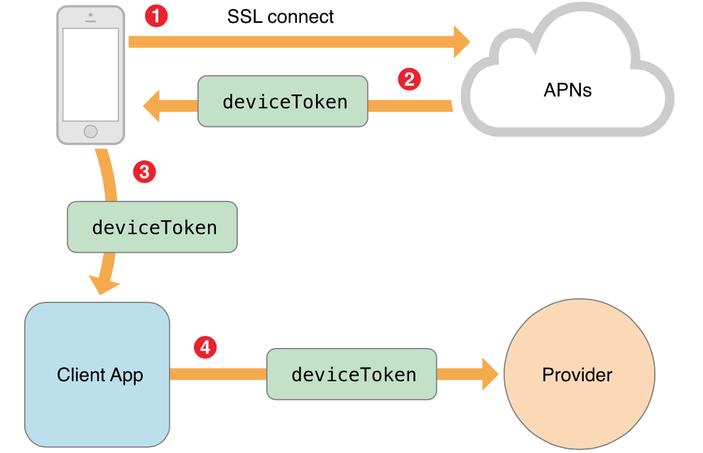 ③手機(jī)再將deviceToken傳遞給app;
