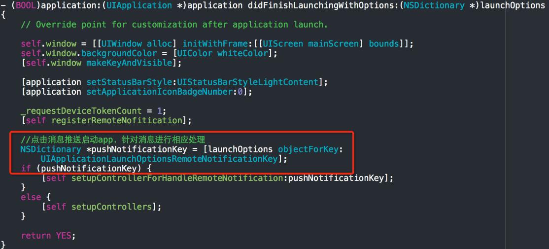同樣屏幕上出現(xiàn)通知提醒,點(diǎn)開消息進(jìn)入app,啟動(dòng)時(shí)“didFinishLaunchingWithOptions”方法里的launchOptions對(duì)應(yīng)UIApplicationLaunchOptionsRemoteNotificationKey部分內(nèi)容不再為空,含有的即是推送內(nèi)容,針對(duì)處理即可。