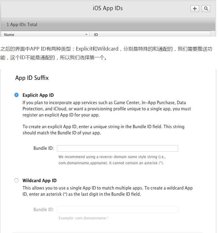 之后的界面中APP ID有兩種類型:Explicit和Wildcard,分別是特殊的和通配的,我們需要推送功能,這個ID不能是通配的,所以我們選擇第一個。
