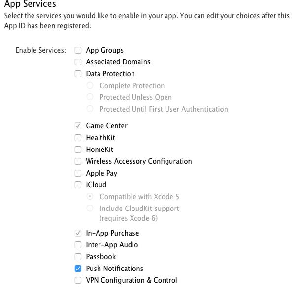 在APP ID的服務設置中,將Push Notification勾選上,點擊continue。