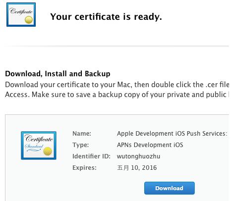 至此,我們已經有了三個文件了,分別是CSR文件,.p12文件,.cer文件。要將這三個文件放在同一個目錄下。.cer文件分為測試和產品兩個,需要哪個自行選擇。寫了這么多,我們的準備工作可算是做完了,不要灰心,其實你的推送工作基本上也就做完了。只是申請過程麻煩了一些,但工程的代碼,我們幾乎不用怎么配置。