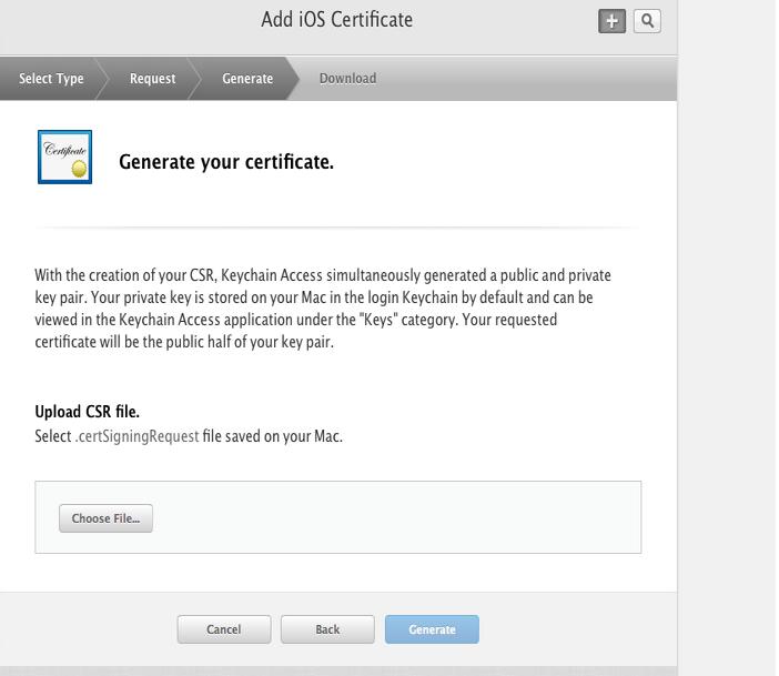 接著點擊continue,如下界面會讓我們選擇一個CSR文件,我們第一步創建的文件在這里派上用場了,選擇那個文件,點擊Generate。