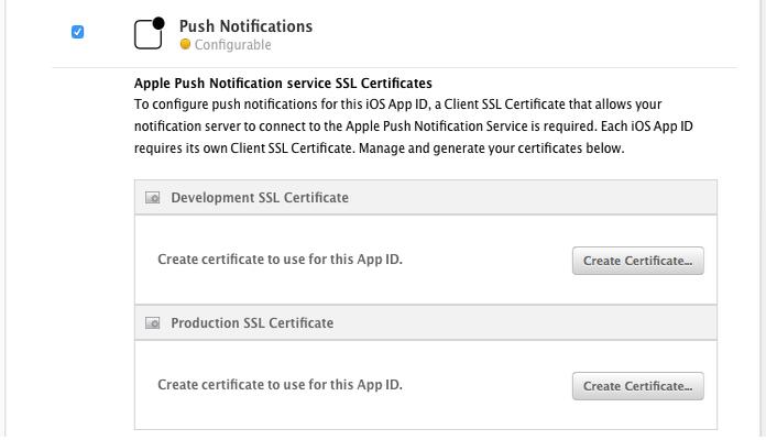 在Push Notifications設置里是如下界面,development是開發證書,Production是產品證書,我們現在需要測試,所以用Development證書,上線時要使用Production證書。點擊Create Certificate。