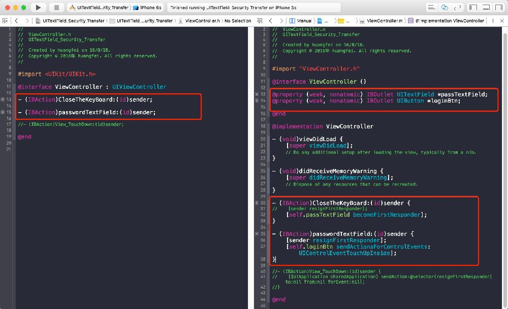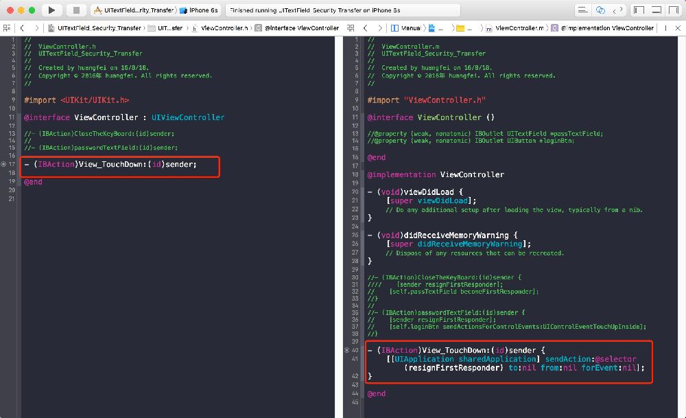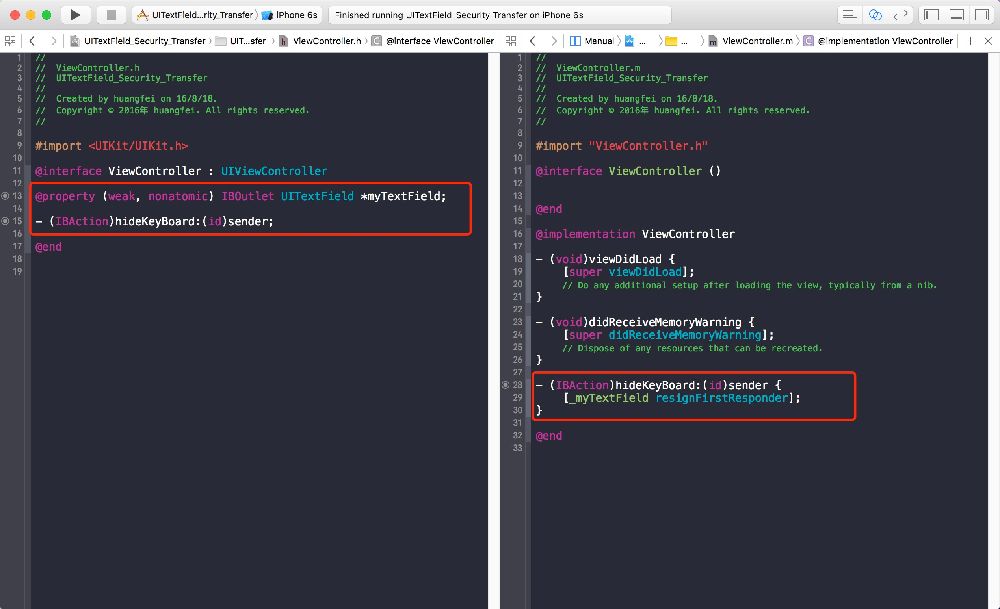 出發軟鍵盤隱藏最常用的事件是文本框的 Did End on Exit,它在用戶按軟鍵盤中的 Done 鍵時發生。選中一個UITextField控件,點擊鼠標右鍵彈出面板,鼠標左鍵按住 Did End on Exit 事件旁邊的圓圈,然后拖曳到右側 .h 文件中,命名為 CloseTheKeyBoard,在 m 文件中具體實現如下圖所示(此處同時顯示 .h 文件與 .m 文件):