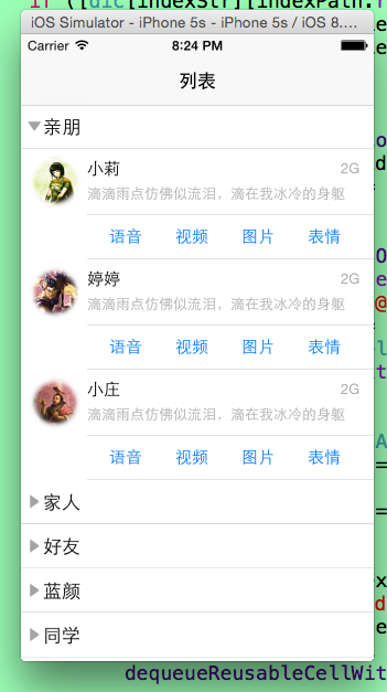 #import "RootViewController.h"#import "MainCell.h"#import "DetialTableViewCell.h"@interface RootViewController ()<UITableViewDataSource,UITableViewDelegate>{ UITableView *_tableView; NSMutableDictionary *dic;//存對應的數(shù)據(jù) NSMutableArray *selectedArr;// 二級列表是否展開狀態(tài) NSMutableArray *titleDataArray; NSArray *dataArray;//數(shù)據(jù)源,顯示每個cell的數(shù)據(jù) NSMutableDictionary *stateDic;//三級列表是否展開狀態(tài) NSMutableArray *groupArr0; NSMutableArray *groupArr1; NSMutableArray *groupArr2; NSMutableArray *groupArr3; NSMutableArray *groupArr4; NSMutableArray *groupArr5; }@end@implementation RootViewController- (void)viewDidLoad { [super viewDidLoad]; self.title = @"列表"; dic = [[NSMutableDictionary alloc] init]; selectedArr = [[NSMutableArray alloc] init]; dataArray = [[NSMutableArray alloc] init]; // 初始化tableView _tableView = [[UITableView alloc] initWithFrame:CGRectMake(0, 0, 320*scaleX, [UIScreen mainScreen].bounds.size.height) style:UITableViewStylePlain]; _tableView.delegate = self; _tableView.dataSource = self; // 隱藏滾動條 _tableView.showsVerticalScrollIndicator = NO; _tableView.showsHorizontalScrollIndicator = NO; _tableView.separatorStyle = UITableViewCellSeparatorStyleNone; [self.view addSubview:_tableView]; // 加載數(shù)據(jù) [self loadData];}/** * 加載數(shù)據(jù) */- (void)loadData{ titleDataArray = [[NSMutableArray alloc] initWithObjects:@"親朋",@"家人",@"好友", @"藍顏",@"同學",@"老鄉(xiāng)",nil]; NSMutableDictionary *nameAndStateDic1 = [NSMutableDictionary dictionaryWithObjectsAndKeys:@"MainCell",@"cell",@"小莉",@"name",@"NO",@"state", nil]; NSMutableDictionary *nameAndStateDic2 = [NSMutableDictionary dictionaryWithObjectsAndKeys:@"MainCell",@"cell",@"婷婷",@"name",@"NO",@"state", nil]; NSMutableDictionary *nameAndStateDic3 = [NSMutableDictionary dictionaryWithObjectsAndKeys:@"MainCell",@"cell",@"小莊",@"name",@"NO",@"state", nil]; groupArr0 = [[NSMutableArray alloc] initWithObjects:nameAndStateDic1,nameAndStateDic2,nameAndStateDic3, nil]; NSMutableDictionary *nameAndStateDic4 = [NSMutableDictionary dictionaryWithObjectsAndKeys:@"MainCell",@"cell",@"晨晨姐",@"name",@"NO",@"state",nil]; NSMutableDictionary *nameAndStateDic5 = [NSMutableDictionary dictionaryWithObjectsAndKeys:@"MainCell",@"cell",@"李濤",@"name",@"NO",@"state",nil]; NSMutableDictionary *nameAndStateDic6 = [NSMutableDictionary dictionaryWithObjectsAndKeys:@"MainCell",@"cell",@"海波",@"name",@"NO",@"state",nil]; NSMutableDictionary *nameAndStateDic7 = [NSMutableDictionary dictionaryWithObjectsAndKeys:@"MainCell",@"cell",@"張敏",@"name",@"NO",@"state",nil]; groupArr1 = [[NSMutableArray alloc]initWithObjects:nameAndStateDic4,nameAndStateDic5,nameAndStateDic6,nameAndStateDic7, nil]; NSMutableDictionary *nameAndStateDic8 = [NSMutableDictionary dictionaryWithObjectsAndKeys:@"MainCell",@"cell",@"楊浩",@"name",@"NO",@"state",nil]; NSMutableDictionary *nameAndStateDic9 = [NSMutableDictionary dictionaryWithObjectsAndKeys:@"MainCell",@"cell",@"小明",@"name",@"NO",@"state",nil]; NSMutableDictionary *nameAndStateDic10 = [NSMutableDictionary dictionaryWithObjectsAndKeys:@"MainCell",@"cell",@"洋洋",@"name",@"NO",@"state",nil]; NSMutableDictionary *nameAndStateDic11 = [NSMutableDictionary dictionaryWithObjectsAndKeys:@"MainCell",@"cell",@"趙蒙",@"name",@"NO",@"state",nil]; NSMutableDictionary *nameAndStateDic12 = [NSMutableDictionary dictionaryWithObjectsAndKeys:@"MainCell",@"cell",@"小催",@"name",@"NO",@"state",nil]; NSMutableDictionary *nameAndStateDic13 = [NSMutableDictionary dictionaryWithObjectsAndKeys:@"MainCell",@"cell",@"和平",@"name",@"NO",@"state",nil]; groupArr2 = [[NSMutableArray alloc]initWithObjects:nameAndStateDic8,nameAndStateDic9,nameAndStateDic10,nameAndStateDic11,nameAndStateDic12,nameAndStateDic13,nil]; NSMutableDictionary *nameAndStateDic14 = [NSMutableDictionary dictionaryWithObjectsAndKeys:@"MainCell",@"cell",@"超人",@"name",@"NO",@"state",nil]; NSMutableDictionary *nameAndStateDic15 = [NSMutableDictionary dictionaryWithObjectsAndKeys:@"MainCell",@"cell",@"怪獸",@"name",@"NO",@"state",nil]; groupArr3 = [[NSMutableArray alloc] initWithObjects:nameAndStateDic14,nameAndStateDic15, nil]; NSMutableDictionary *nameAndStateDic16 = [NSMutableDictionary dictionaryWithObjectsAndKeys:@"MainCell",@"cell",@"大包",@"name",@"NO",@"state",nil]; NSMutableDictionary *nameAndStateDic17 = [NSMutableDictionary dictionaryWithObjectsAndKeys:@"MainCell",@"cell",@"小林子",@"name",@"NO",@"state",nil]; NSMutableDictionary *nameAndStateDic18 = [NSMutableDictionary dictionaryWithObjectsAndKeys:@"MainCell",@"cell",@"石頭",@"name",@"NO",@"state",nil]; NSMutableDictionary *nameAndStateDic19 = [NSMutableDictionary dictionaryWithObjectsAndKeys:@"MainCell",@"cell",@"小軒軒",@"name",@"NO",@"state",nil]; NSMutableDictionary *nameAndStateDic20 = [NSMutableDictionary dictionaryWithObjectsAndKeys:@"MainCell",@"cell",@"阿東",@"name",@"NO",@"state",nil]; groupArr4 = [[NSMutableArray alloc]initWithObjects:nameAndStateDic16,nameAndStateDic17,nameAndStateDic18,nameAndStateDic19,nameAndStateDic20, nil]; NSMutableDictionary *nameAndStateDic21 = [NSMutableDictionary dictionaryWithObjectsAndKeys:@"MainCell",@"cell",@"鄭平",@"name",@"NO",@"state",nil]; NSMutableDictionary *nameAndStateDic22 = [NSMutableDictionary dictionaryWithObjectsAndKeys:@"MainCell",@"cell",@"劉凡",@"name",@"NO",@"state",nil]; NSMutableDictionary *nameAndStateDic23 = [NSMutableDictionary dictionaryWithObjectsAndKeys:@"MainCell",@"cell",@"韓琴",@"name",@"NO",@"state",nil]; NSMutableDictionary *nameAndStateDic24 = [NSMutableDictionary dictionaryWithObjectsAndKeys:@"MainCell",@"cell",@"劉華健",@"name",@"NO",@"state",nil]; NSMutableDictionary *nameAndStateDic25 = [NSMutableDictionary dictionaryWithObjectsAndKeys:@"MainCell",@"cell",@"彭曉明",@"name",@"NO",@"state",nil]; NSMutableDictionary *nameAndStateDic26 = [NSMut