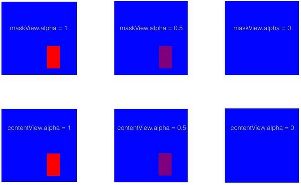 通過實驗我們可以看到修改視圖自身的透明度或者修改maskView的透明度達成的效果是一樣的。換句話說,遮蓋視圖對于視圖自身的影響直接決定在透明度和顯示尺寸這兩個可視的屬性。