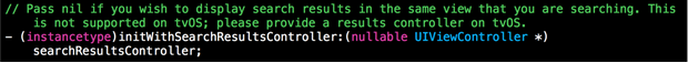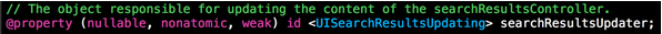系統(tǒng)的注釋說的很清楚,如果想要在當前頁顯示搜索結果,這個方法的參數填nil即可,為了方便起見,聲明一個UISearchController的屬性
