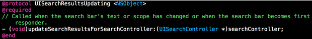 根據字面意思我們可以猜到這跟搜索結果的更新有關,就跟tableView的reloadData一個意思.那么很明顯,我們得簽協(xié)議<UISearchResultsUpdating>,這個協(xié)議中只有一個必須要實現的方法.