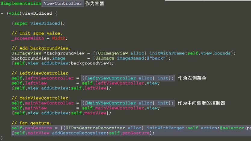 //// ViewController.m// SideViewController//// Created by YouXianMing on 16/6/6.// Copyright © 2016年 YouXianMing. All rights reserved.//#import "ViewController.h"#import "LeftViewController.h"#import "MainViewController.h"#import "UIView+SetRect.h"@interface ViewController () { CGFloat _screenWidth;}@property (nonatomic, strong) UIPanGestureRecognizer *panGesture;@property (nonatomic) CGPoint panBeginPoint;@property (nonatomic, strong) LeftViewController *leftViewController;@property (nonatomic, strong) UIView *leftView;@property (nonatomic, strong) MainViewController *mainViewController;@property (nonatomic, strong) UIView *mainView;@end@implementation ViewController- (void)viewDidLoad { [super viewDidLoad]; // Init some value. _screenWidth = Width; // Add backgroundView. UIImageView *backgroundView = [[UIImageView alloc] initWithFrame:self.view.bounds]; backgroundView.image = [UIImage imageNamed:@"back"]; [self.view addSubview:backgroundView]; // LeftViewController self.leftViewController = [[LeftViewController alloc] init]; self.leftView = self.leftViewController.view; [self.view addSubview:self.leftView]; // MainViewController self.mainViewController = [[MainViewController alloc] init]; self.mainView = self.mainViewController.view; [self.view addSubview:self.mainView]; // Pan gesture. self.panGesture = [[UIPanGestureRecognizer alloc] initWithTarget:self action:@selector(panGestureEvent:)]; [self.mainView addGestureRecognizer:self.panGesture];}- (void)panGestureEvent:(UIPanGestureRecognizer *)gesture { CGPoint translation = [gesture translationInView:gesture.view]; CGPoint velocity = [gesture velocityInView:gesture.view]; CGFloat gap = _screenWidth / 3.f * 2; CGFloat sensitivePosition = _screenWidth / 2.f; if (velocity.x < 0 && _mainView.x <= 0) { // 過濾掉向左側滑過頭的情形 _mainView.x = 0.f; } else { if (gesture.state == UIGestureRecognizerStateBegan) { // 開始 _panBeginPoint = translation; if (_mainView.x >= sensitivePosition) { _panBeginPoint.x -= gap; } } else if (gesture.state == UIGestureRecognizerStateChanged) { // 值變化 _mainView.x = translation.x - _panBeginPoint.x; if (_mainView.x <= 0) { // 過濾掉向左側滑過頭的情形 _mainView.x = 0.f; } } else if (gesture.state == UIGestureRecognizerStateEnded) { // 結束 [UIView animateWithDuration:0.20f animations:^{ _mainView.x >= sensitivePosition ? (_mainView.x = gap) : (_mainView.x = 0); }]; } }}@end