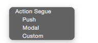 在StoryBoard中進行界面跳轉是十分方便的,我們在StoryBoard中拉入兩個ViewController,在一個上面添加一個按鈕,點住按鈕按住control,將鼠標拉到第二個controller上,會出現如下的跳轉選項: