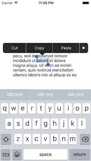在iOS的UI系統中,有3個控件自帶剪切板操作,分別是UITextField、UITextView與UIWebView。在這些控件的文字交互處進行長按手勢可以在屏幕視圖上喚出系統的剪切板控件,用戶可以進行復制、粘貼,剪切等操作,其效果分別如下圖所示。