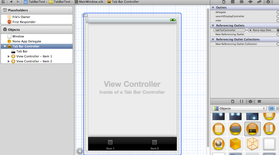 要創(chuàng)建兩個這樣的對象然后將其連接起來。window這時已經(jīng)有了,還少個UITabBarController。那么我們從右邊拖個過來咯