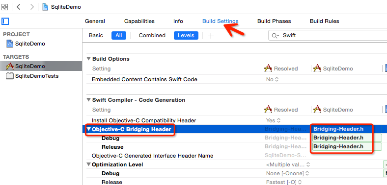 5、最后一步,在項目配置界面,選擇Build Setting,搜索框中輸入swift,在結果中選擇Objective-C Bridging Header,輸入剛才新建的橋接文件的名稱: