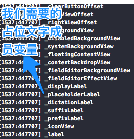(void)initialize {unsigned int count = 0;Ivar *ivars = class_copyIvarList([UITextField class] , &count);for (int i = 0; i < count; i++) {//取出成員變量Ivar ivar = *(ivars + i);//打印成員變量名字DDZLog(@"%s",ivar_getName(ivar));}}利用class_copyIvarList這個C函數(shù),將所有的成員變量打印出來