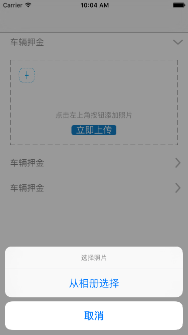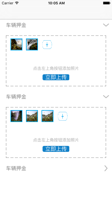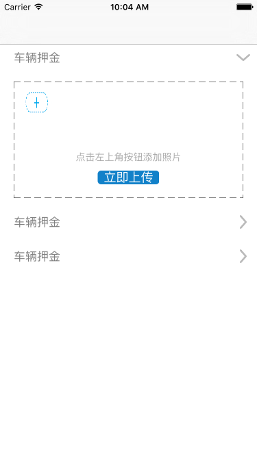//header// Copyright © 2016年 Chason. All rights reserved.//#import <UIKit/UIKit.h>@interface DepositFeeHeader : UITableViewHeaderFooterView@property (nonatomic, strong) UILabel *titleLabel;@property (nonatomic, strong) UIImageView *listImage;//尾按鈕@property (nonatomic, strong) UIGestureRecognizer *tap;@end// Copyright © 2016年 Chason. All rights reserved.//#import "DepositFeeHeader.h"http://手機屏幕的寬和高#define kScreenWidth [UIScreen mainScreen].bounds.size.width#define KScreenHeight [UIScreen mainScreen].bounds.size.height@implementation DepositFeeHeader- (instancetype)initWithReuseIdentifier:(NSString *)reuseIdentifier{self = [super initWithReuseIdentifier:reuseIdentifier];if (self) {UIView *backView = [[UIView alloc] initWithFrame:CGRectMake(0, 0, kScreenWidth, 40)];backView.backgroundColor = [UIColor whiteColor];[self addSubview:backView];self.titleLabel = [[UILabel alloc] initWithFrame:CGRectMake(20, 10, kScreenWidth - 45, 20)];self.titleLabel.text = @"車輛押金";self.titleLabel.userInteractionEnabled = YES;self.titleLabel.textColor = [UIColor grayColor];[backView addSubview:self.titleLabel];self.listImage = [[UIImageView alloc] initWithFrame:CGRectMake(kScreenWidth - 25, 10, 10, 20)];self.listImage.image = [UIImage imageNamed:@"jiantou.png"];[backView addSubview:self.listImage];UIImageView *headerLine = [[UIImageView alloc] initWithFrame:CGRectMake(0, 0, kScreenWidth, 1)];headerLine.image = [UIImage imageNamed:@"line"];[backView addSubview:headerLine];UIImageView *footerLine = [[UIImageView alloc] initWithFrame:CGRectMake(0, 39, kScreenWidth, 1)];footerLine.image = [UIImage imageNamed:@"line"];[backView addSubview:footerLine];self.tap = [[UITapGestureRecognizer alloc] init];[self addGestureRecognizer:self.tap];}return self;}@end//cell// Copyright © 2016年 Chason. All rights reserved.//#import <UIKit/UIKit.h>@interface DepositFeeWithApplyTableViewCell : UITableViewCell@property (nonatomic, strong) UIView *backView;@property (nonatomic, strong) UIButton *cameraBtn;@property (nonatomic, strong) UIImageView *photoImg;@property (nonatomic, strong) UILabel *updatePresent;@property (nonatomic, strong) UIButton *shouldBtn;@end// Copyright © 2016年 Chason. All rights reserved.//#import "DepositFeeWithApplyTableViewCell.h"http://手機屏幕的寬和高#define kScreenWidth [UIScreen mainScreen].bounds.size.width#define KScreenHeight [UIScreen mainScreen].bounds.size.height@implementation DepositFeeWithApplyTableViewCell- (instancetype)initWithStyle:(UITableViewCellStyle)style reuseIdentifier:(NSString *)reuseIdentifier{self = [super initWithStyle:style reuseIdentifier:reuseIdentifier];if (self) {_backView = [[UIView alloc] initWithFrame:CGRectMake(20, 15, kScreenWidth - 40, 170)];[self addSubview:_backView];[self addDottedLineFromImageView:_backView];self.updatePresent = [[UILabel alloc] initWithFrame:CGRectMake(0, 0, kScreenWidth - 40, 20)];self.updatePresent.center = CGPointMake((kScreenWidth - 40) / 2, 110);self.updatePresent.text = @"點擊左上角按鈕添加照片";self.updatePresent.textColor = [UIColor lightGrayColor];self.updatePresent.textAlignment = NSTextAlignmentCenter;self.updatePresent.font = [UIFont systemFontOfSize:14];[_backView addSubview:self.updatePresent];self.shouldBtn = [UIButton buttonWithType:UIButtonTypeCustom];self.shouldBtn.frame = CGRectMake((kScreenWidth - 40) / 2 - 45, 130, 90, 20);[self.shouldBtn setTitleColor:[UIColor whiteColor] forState:UIControlStateNormal];[self.shouldBtn setTitle:@"立即上傳" forState:UIControlStateNormal];self.shouldBtn.layer.cornerRadius = 5;self.shouldBtn.backgroundColor = [UIColor colorWithRed:18/255.0 green:129/255.0 blue:201/255.0 alpha:1];[_backView addSubview:self.shouldBtn];}return self;}//添加虛線框- (void)addDottedLineFromImageView:(UIView *)superView{CGFloat w = superView.frame.size.width;CGFloat h = superView.frame.size.height;CGFloat padding = 20;//創建四個imageView作邊框for (NSInteger i = 0; i<4; i++) {UIImageView *imageView = [[UIImageView alloc] init];imageView.backgroundColor = [UIColor clearColor];if (i == 0) {imageView.frame = CGRectMake(0, 0, w, padding);}else if (i == 1){imageView.frame = CGRectMake(0, 0, padding, h);}else if (i == 2){imageView.frame = CGRectMake(0, h - padding, w, padding);}else if (i == 3){imageView.frame = CGRectMake(w - padding, 0, padding, h);}[superView addSubview:imageView];UIGraphicsBeginImageContext(imageView.frame.size); //開始畫線[imageView.image drawInRect:CGRectMake(0, 0, imageView.frame.size.width, imageView.frame.size.height)];CGContextSetLineCap(UIGraphicsGetCurrentContext(), kCGLineCapRound); //設置線條終點形狀CGFloat lengths[] = {10,5};CGContextRef line = UIGraphicsGetCurrentContext();CGContextSetStrokeColorWithColor(line, [UIColor blackColor].CGColor);CGContextSetLineDash(line, 0, lengths, 2); //畫虛線CGContextMoveToPoint(line, 0, 0); //開始畫線if (i == 0) {CGContextAddLineToPoint(line, w, 0);}else if (i == 1){CGContextAddLineToPoint(line, 0, w);}else if (i == 2){CGContextMoveToPoint(line, 0, padding);CGContextAddLineToPoint(line, w, padding);}else if (i == 3){CGContextMoveToPoint(line, padding, 0);CGContextAddLineToPoint(line, padding, w);}CGContextStrokePath(line);imageView.image = UIGraphicsGetImageFromCurrentImageContext();}}@end4.collectionView布局和自定義item