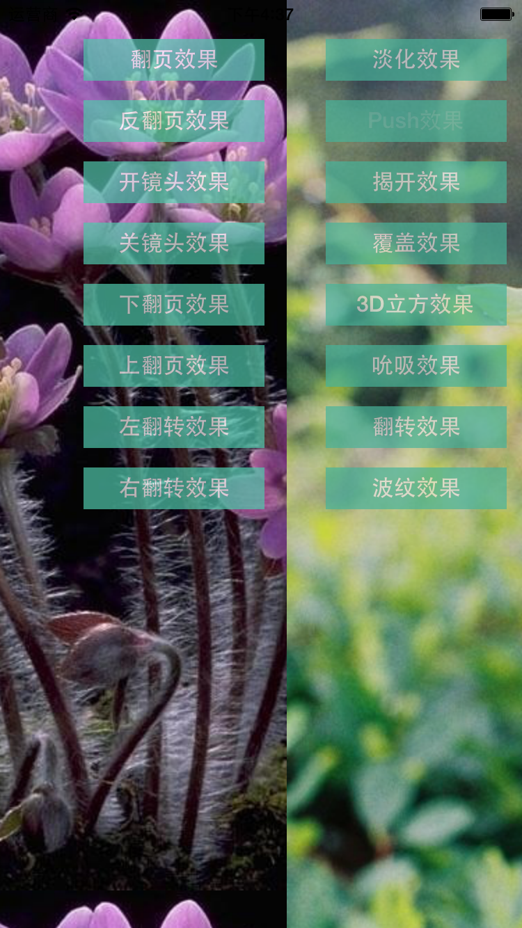#pragma CATransition動畫實現- (void) transitionWithType:(NSString *) type WithSubtype:(NSString *) subtype ForView : (UIView *) view{//創建CATransition對象CATransition *animation = [CATransition animation];//設置運動時間animation.duration = DURATION;//設置運動typeanimation.type = type;if (subtype != nil) {//設置子類animation.subtype = subtype;}//設置運動速度animation.timingFunction = UIViewAnimationOptionCurveEaseInOut;[view.layer addAnimation:animation forKey:@"animation"];} 代碼說明: