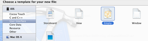 4、創(chuàng)建CustomCell.xib:依次選擇File ― New ― New File,在彈出的窗口,左邊選擇User Interface,右邊選擇Empty: