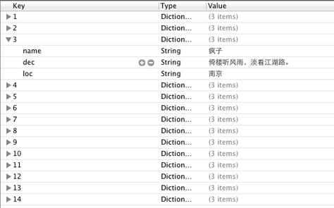 不過在此之前,我們先新建一個(gè)plist,用于存儲(chǔ)想要顯示的數(shù)據(jù)。建立plist文件的方法前面的文章有提到。我們建好一個(gè)friendsInfo.plist,往其中添加數(shù)據(jù)如下: