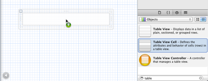 5、打開CustomCell.xib,拖一個(gè)Table View Cell控件到面板上: