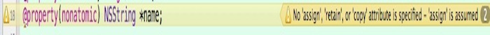 上面的代碼1和2是等價的,3和4是等價的,5,6,7是等價的。也就是說atomic是默認行為,assign是默認行為,readwrite是默認行為。但是,如果你寫上@property(nontomic)NSString *name;那么將會報一個警告,如下圖: