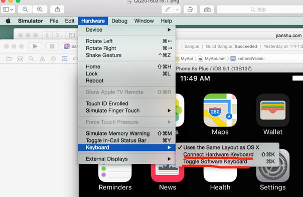 解決辦法:如上圖:切換模擬器到前臺,畫紅線的第一個意思是連接實體鍵盤,選中的話就是在模擬器上我們直接可以使用外接鍵盤進行輸入;第二行畫橫線的意思就是使用軟鍵盤!如果模擬器不能彈出鍵盤,我們可以手動去掉第一行畫紅線的選中狀態,或者直接使用快捷鍵commod + k 切換,如果需要使用實體鍵盤,選中第一行紅線的選項,或者使用快捷鍵shift + commod +k 切換!