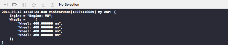 我們的汽車結(jié)構(gòu)很簡單,只包含1個引擎,4個車輪,并且各個類也沒有復(fù)雜的實(shí)現(xiàn),僅僅覆寫了description,讓其輸出簡要的信息。好,實(shí)例化一輛Car, 看看效果: