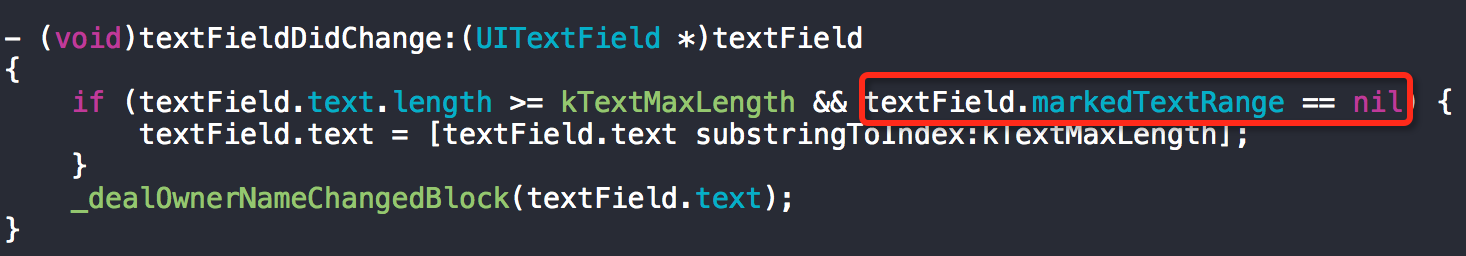 解決辦法是判斷一下markedTextRange是否為nil,即沒有聯(lián)想狀態(tài)或高亮狀態(tài)下的文字時(shí),再進(jìn)行文字限長檢查或賦值