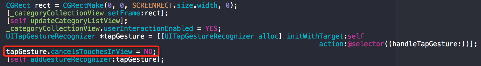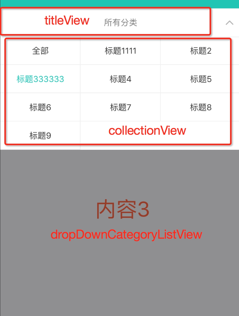 dropDownCategoryListView添加了tap手勢,點擊view則通知controller收起移除下拉分類菜單 ,collectionView作為一部分,點擊collectionView也會通知controller收起移除下拉分類菜單,顯然不符合要求,解決辦法是將手勢的cancelsTouchesInView屬性設為NO,即將touch事件也傳遞到collectionView上,didSelect選中分類后繼續處理即可。