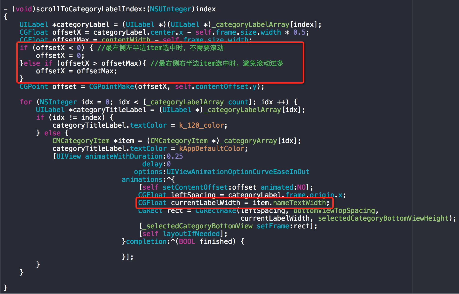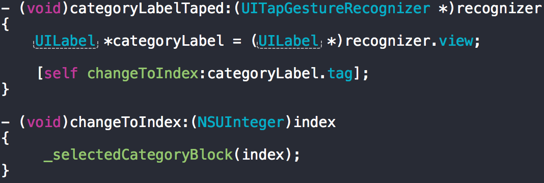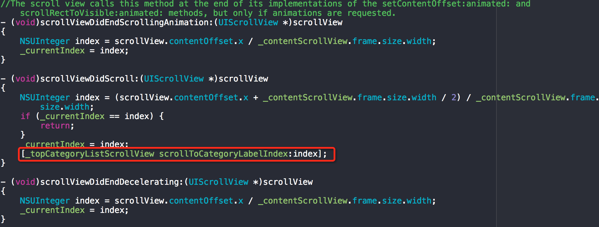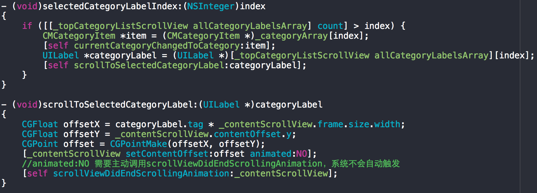 這里需要說明一下,scrollViewDidEndScrollingAnimation原本是內容視圖滑動結束后調用,用來通知導航欄滑動到對應分類標簽。scrollViewDidEndDecelerating是處理手指在屏幕上滑動內容視圖結束后調用,也是通知導航欄滑動到對應分類標簽。但是為了讓滑動時分類標簽切換顯示效果更更連貫,在scrollViewDidScroll里進行了處理,當滑出一定距離,新的index與當前index不一致時就通知導航欄切換分類標簽,實際上scrollViewDidEndScrollingAnimation和scrollViewDidEndDecelerating這時已經可以去掉了。