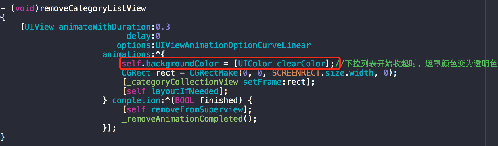 下拉菜單的展開和收起漸變效果用UIView的animation即可,需要注意的是收起動畫效果,需要先去掉陰影,然后收起下拉菜單,這里的陰影其實就是dropDownCategoryListView設置了一定透明度的背景色,所以先將背景色設成clearColor再收起菜單即可。