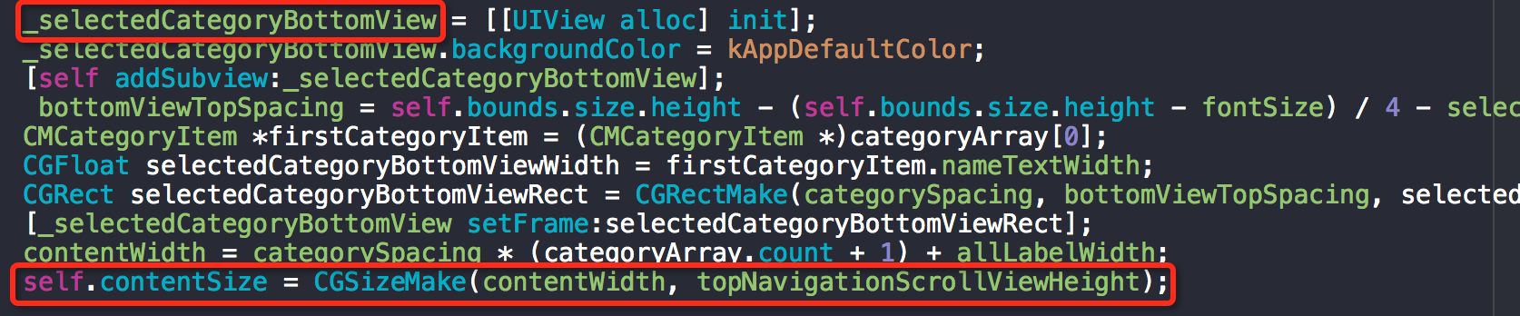 分類名稱底部的下劃線隨著分類label走,默認選中第一個label,所以下劃線默認也是停留在第一個,并且根據分類數量設置好頂部導航欄的contentSize。