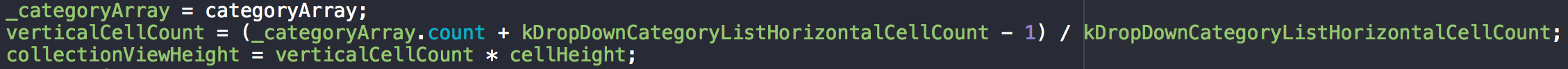 這里每一行顯示三個分類數據,分類數量及cell高度確定后即可確定collectionView的高度,即先確定縱向有幾行分類數據,行數xcell高度就是collectionView 高度。