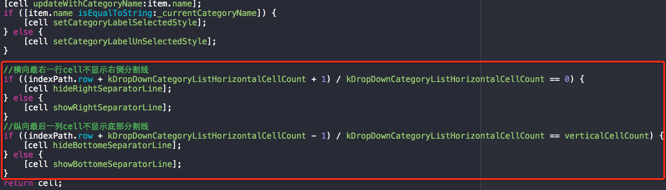 對于分類cell的分隔線效果,可能最容易想到的就是cell之間留出間隙,collectionView背景色設置一下就行了,但是這里有兩個問題,首先是三等分cell加上留出的間隙,間隙的寬度會帶有小數,顯示出來的效果粗細不均,并且這里cell與collectionview背景色都為白色,留出空隙也無法形成分隔線的視覺效果,所以只能在cell內部處理,底部和右側加分隔線,根據cell所處位置控制分隔線顯示與否。