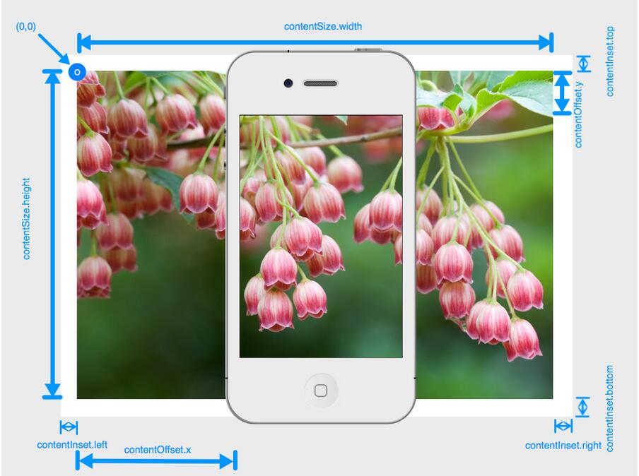 contentSize、contentInset、contentOffset在開發中會經常使用,為了幫助大家理解這里以圖形的形式展現三者之間的關系: