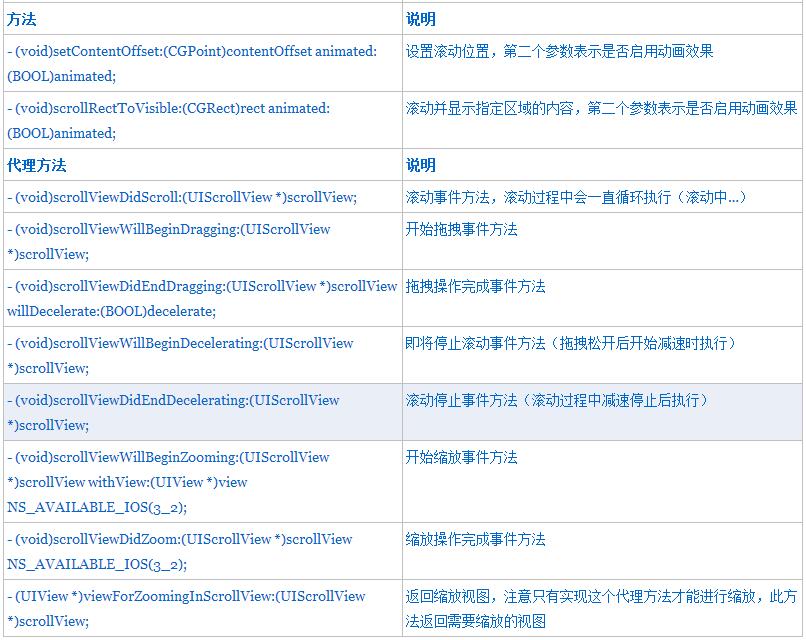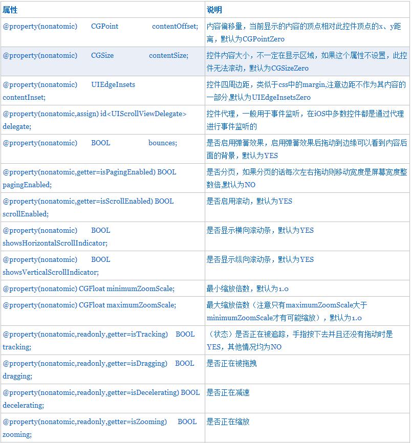 通過上面的介紹相信大家對于UIView的基本操作應該比較熟悉了,那么下面就看一下UIView的子控件UIScrollView 。顧名思義,這是一個可以處理滾動操作的視圖,UIScrollView在開發過程中使用很頻繁,而且它也經常作為其他控件的子控件,例如UITableView就繼承自UIScrollView。 我們還是先看一下UIScrollView的常用屬性和方法: