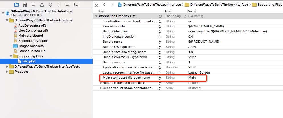 但是,我們應該認識到一個更重要的本質:使用 StoryBoard 的 iOS 項目均以初始化 StoryBoard 文件作為整個程序的初始化入口,UIViewController 類是由于被 StoryBoard 綁定而初始化,從而開始運行的。從下面兩個地方可以找到蛛絲馬跡: