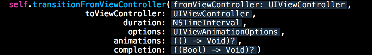 這個方法雖然已經過時,但是對它的分析有助于后面知識的理解。它一共有6個參數,前兩個表示從哪個VC開始,跳轉到哪個VC,中間兩個參數表示動畫的時間和選項。最后兩個參數表示動畫的具體實現細節和回調閉包。
